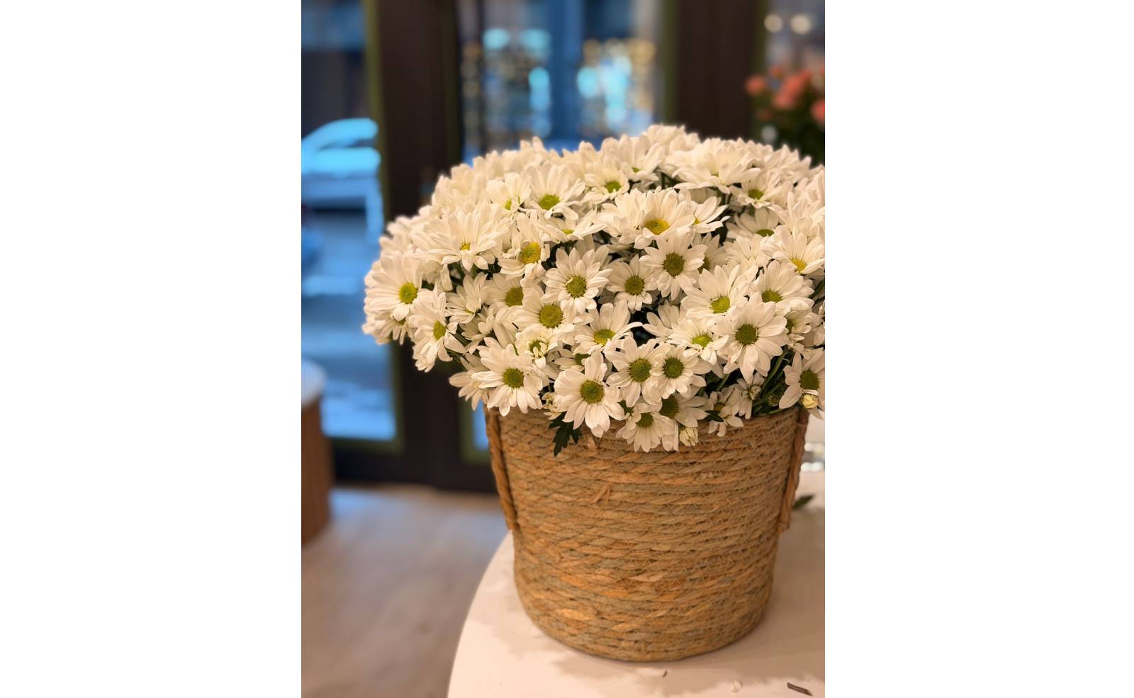 თეთრი გვირილებით სავსე კალათი სიყვარულის გამოსახატად.