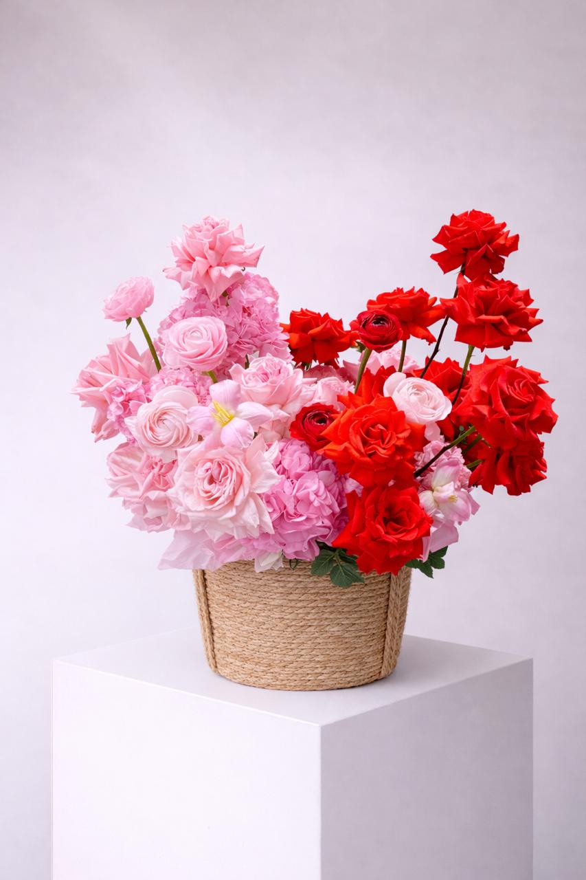 ფრანგულად გაშლილი წითელი და ვარდისფერი ვარდების ელეგანტური კომპოზიცია.